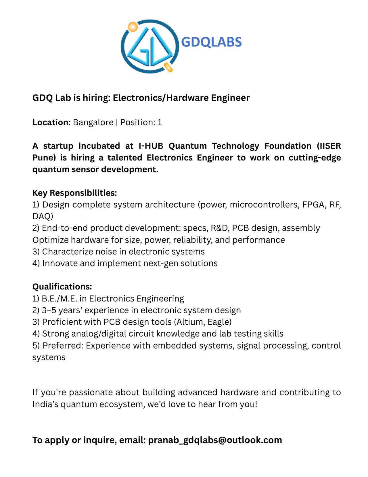 GDQ Labs, a startup incubated at I-HUB Quantum Technology Foundation (I-HUB QTF), Indian Institute of Science Education and Research (IISER), Pune, is hiring for the position of Electronics/Hardware Engineer in Bangalore.